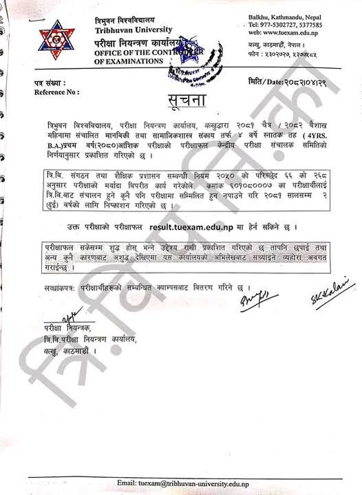 #आज मिति २०८२/०४/२९ गतेका दिनमा ४ बर्षे B.A तर्फको प्रथम बर्ष (२०८०) को आंशिक तर्फको २०८१ चैत्र र २०८२ साल बैशाखमा सञ्चालन भएको परीक्षाको नतिजा
