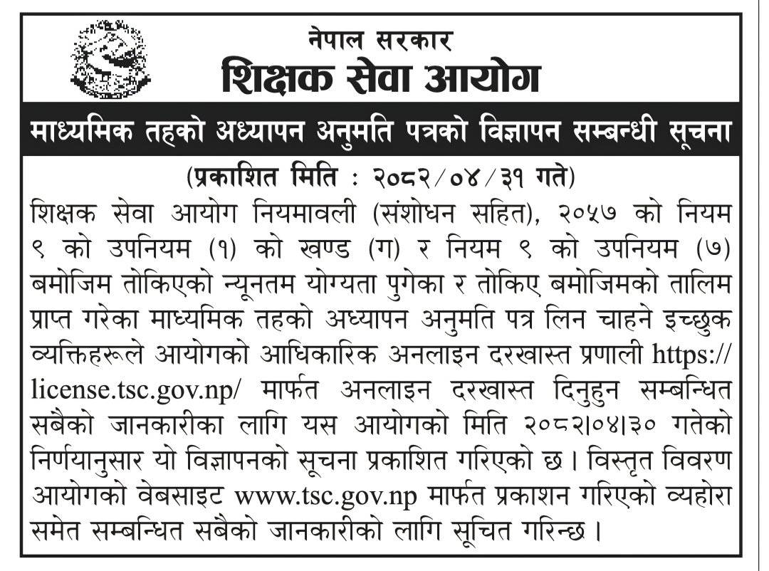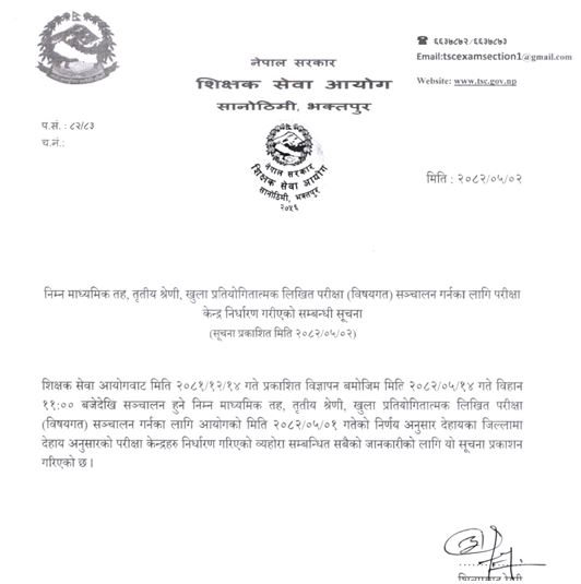 मिति २०८२/०५/१४ गते विहान ११:०० वजेदेखि सञ्चालन हुने निम्नमाध्यमिक तह, तृतीय श्रेणी, खुला प्रतियोगितात्मक लिखित परीक्षा (विषयगत) परीक्षाको केन्द्र निर्धारण गरिएकोसम्बन्धी सूचना